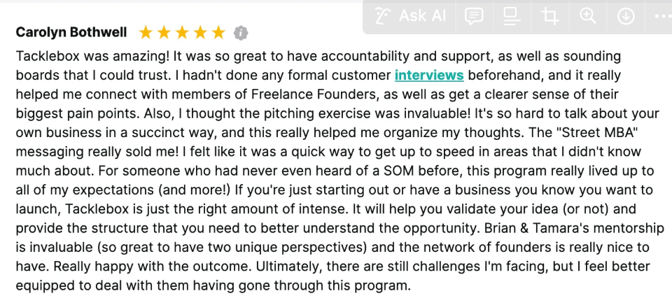 Over 10 days we have three live-on-zoom workshops and one individual, 30-minute one-on-one between you and Brian. You’ll learn how to find people, how to interview them, what to take away from those interviews, when you’re done with interviews, and what to do next.